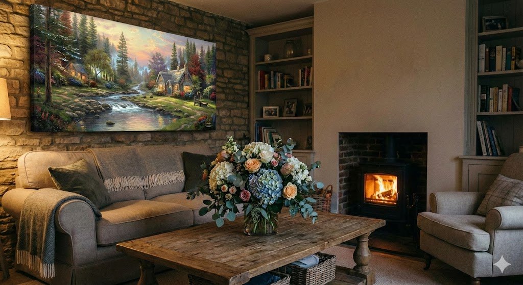- Illuminated Canvas Prints: These aren’t just flat posters. They are canvas prints with built-in LED lights that make the cottage windows and streetlamps in the painting actually glow. It brings the art to life in a dimly lit room.